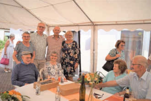 Die erste Vorsitzende Birgit Lauer (4.v.l.) und der zweite Vorsitzende Joachim Roth (3.v.r.) mit den Gästen: Schirmherr, VVB- Vorstandsvorsitzender Edgar Soester (2.v.r.), STB-Präsident Dr. Joachim Meier (3.v.l.), MdL Sebastian Schmitt (4.v.r.), Kreisbeigeordneter Thorsten Rehlinger (rechts), Bürgermeister Thomas Collmann (2.v.l.), Ortsvorsteher Joachim Gratz (links) und Ortsratsmitglied Katharina Lauer (5.v.r.). Die geehrten Gründungsmitglieder Horst Hippchen (links, sitzend), Monika Hippchen (rechts davon, sitzend), Annelie Lorang (links dahinter, stehend), Franz-Josef Lauer (daneben, stehend), der älteste aktive Spieler Fred Scholl (rechts daneben, stehend) und die erste Vorsitzende Birgit Lauer (rechts, stehend).